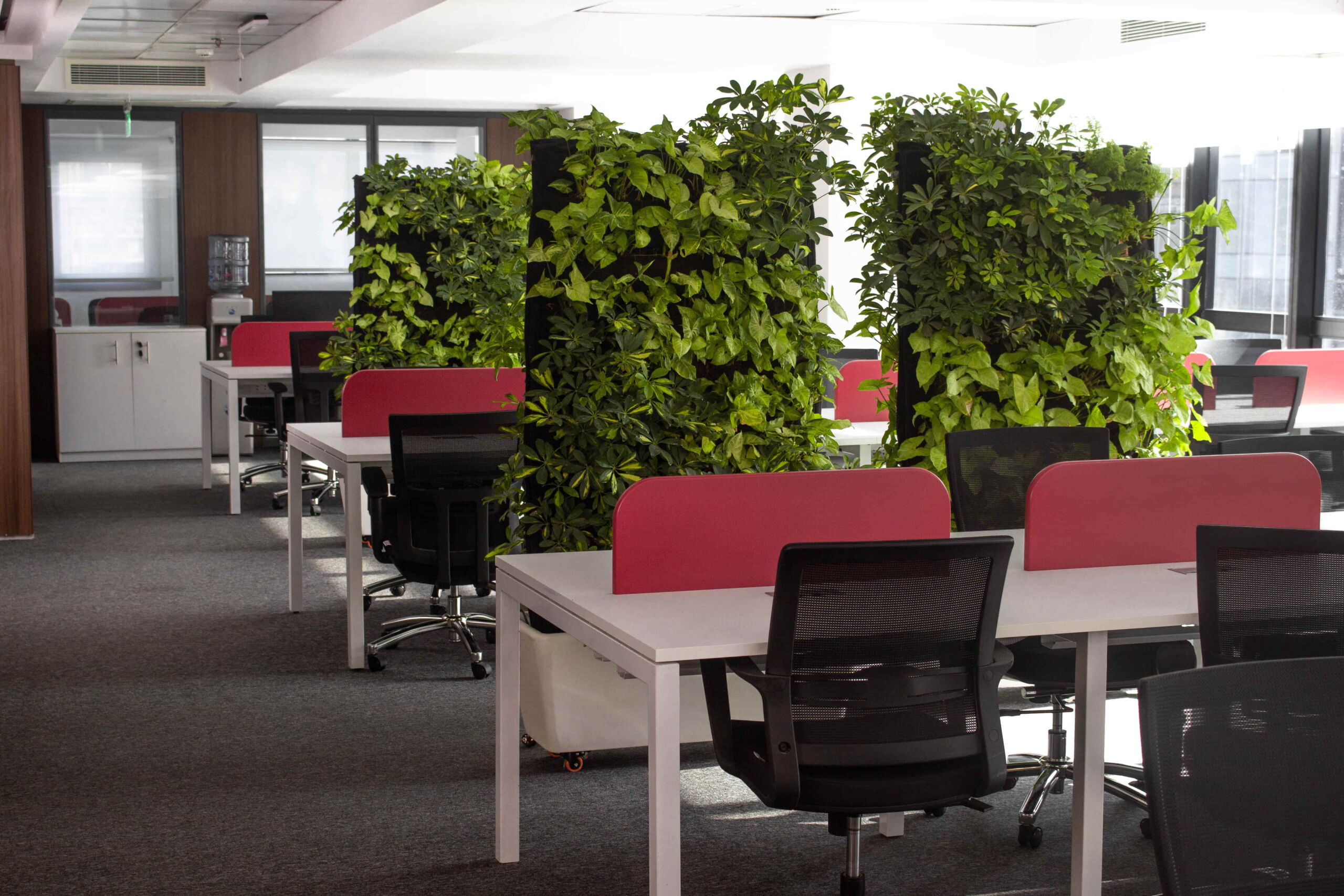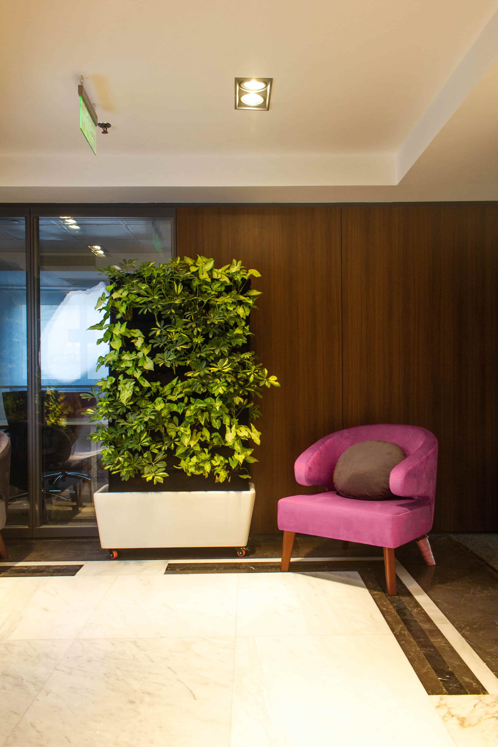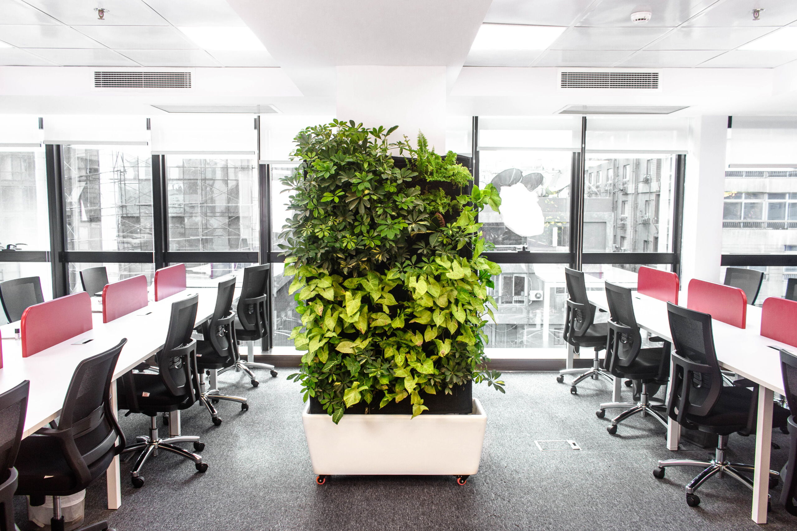 The Standalone Green Wall uses a hydroponic system where plants grow without soil, making it easy to maintain and clean.